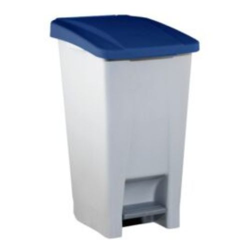 Contenedor de 60 litros diseñado para la recogida y clasificación de residuos, equipado con tapa de color azul para facilitar la separación por tipo de desecho. Fabricado en plástico resistente, incorpora pedal para apertura higiénica, dos ruedas para facilitar el desplazamiento y asa ergonómica para un manejo cómodo.