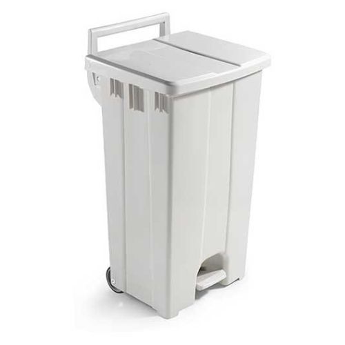 Contenedor fabricado a partir de polipropileno con tapa abatible, pedal y ruedas para la recogida de residuos.