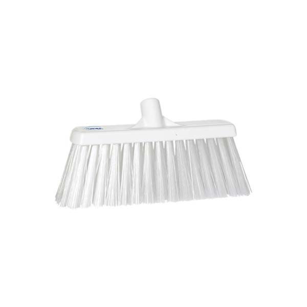 Escoba robusta fabricada en polipropileno, poliéster y acero inoxidable para la limpieza de partículas pesadas de suciedad en zonas húmedas o exteriores.