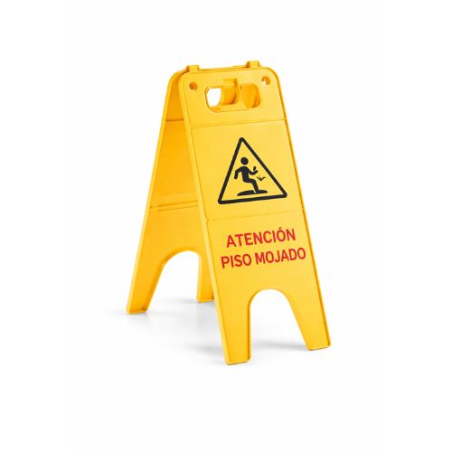 Señal doble de advertencia “ATENCIÓN PISO MOJADO”, fabricada en polipropileno robusto y equipada con un sistema de enganche rápido patentado. Su formato de caballete ofrece alta visibilidad y máxima estabilidad, ideal para prevenir accidentes y garantizar la seguridad en áreas de limpieza.
